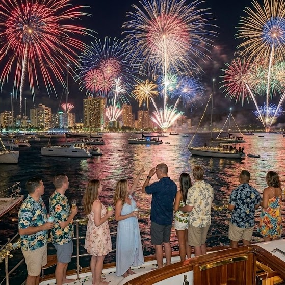The show can be enjoyed from dozens of vantage points across Waikiki and beyond. Popular spots include the sands of Waikiki Beach between the Hilton Hawaiian Village and the Outrigger Reef, the grassy lawns of Ala Moana Beach Park, Magic Island, Fort DeRussy Beach Park, and hotel lanais and rooftop bars throughout the neighborhood. For the most unobstructed and memorable view however, nothing beats watching from the open ocean — where the entire Waikiki skyline, Diamond Head, and the fireworks overhead combine into one unforgettable scene.